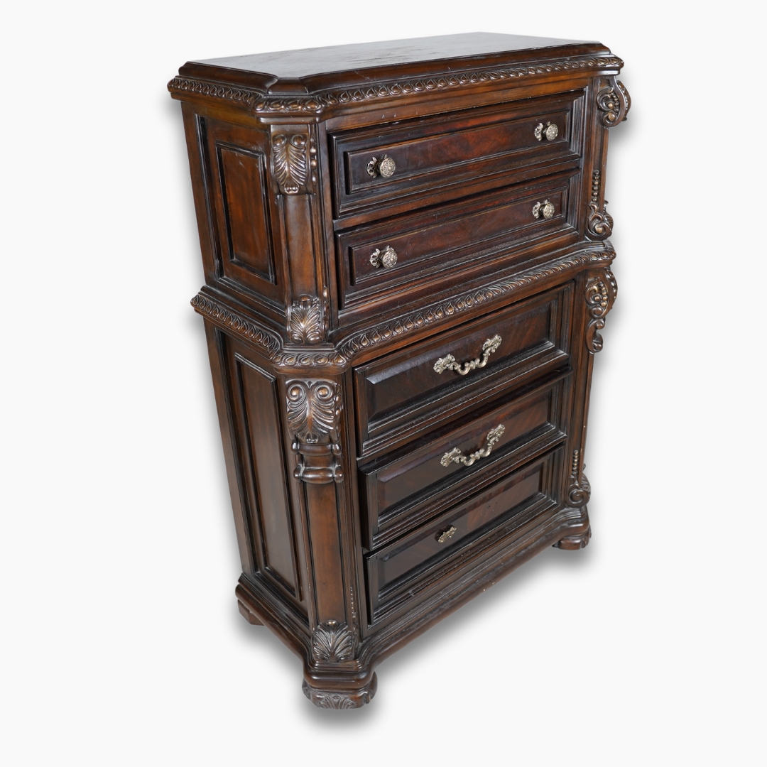 نقدم لكم خزانة جانبية كلاسيكية بأدراج لغرفة النوم، تجسيدًا حقيقيًا للأناقة الكلاسيكية والحرفية. هذه الخزانة الجانبية الكلاسيكية مصنوعة من خشب صلب بلمسة نهائية من خشب الماهوجني الفاخر، مما يخلق قطعةً تنضح بالفخامة والسحر الخالد.