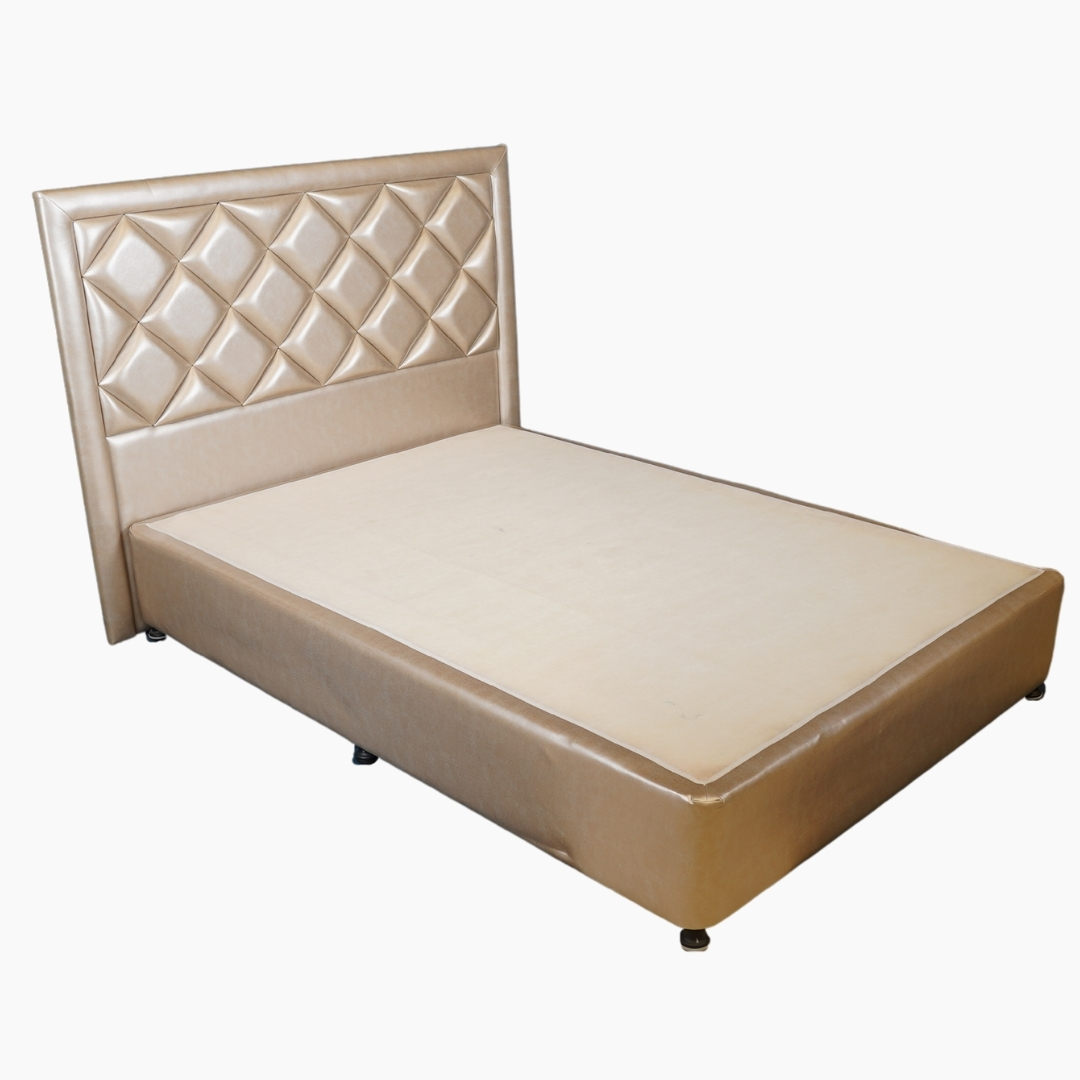 سرير باللون البيج مع رأس سرير مبطن يوفر الراحة والدعم لغرفة النوم. تصميم عملي يتناسب مع مختلف أنواع أثاث غرف النوم.