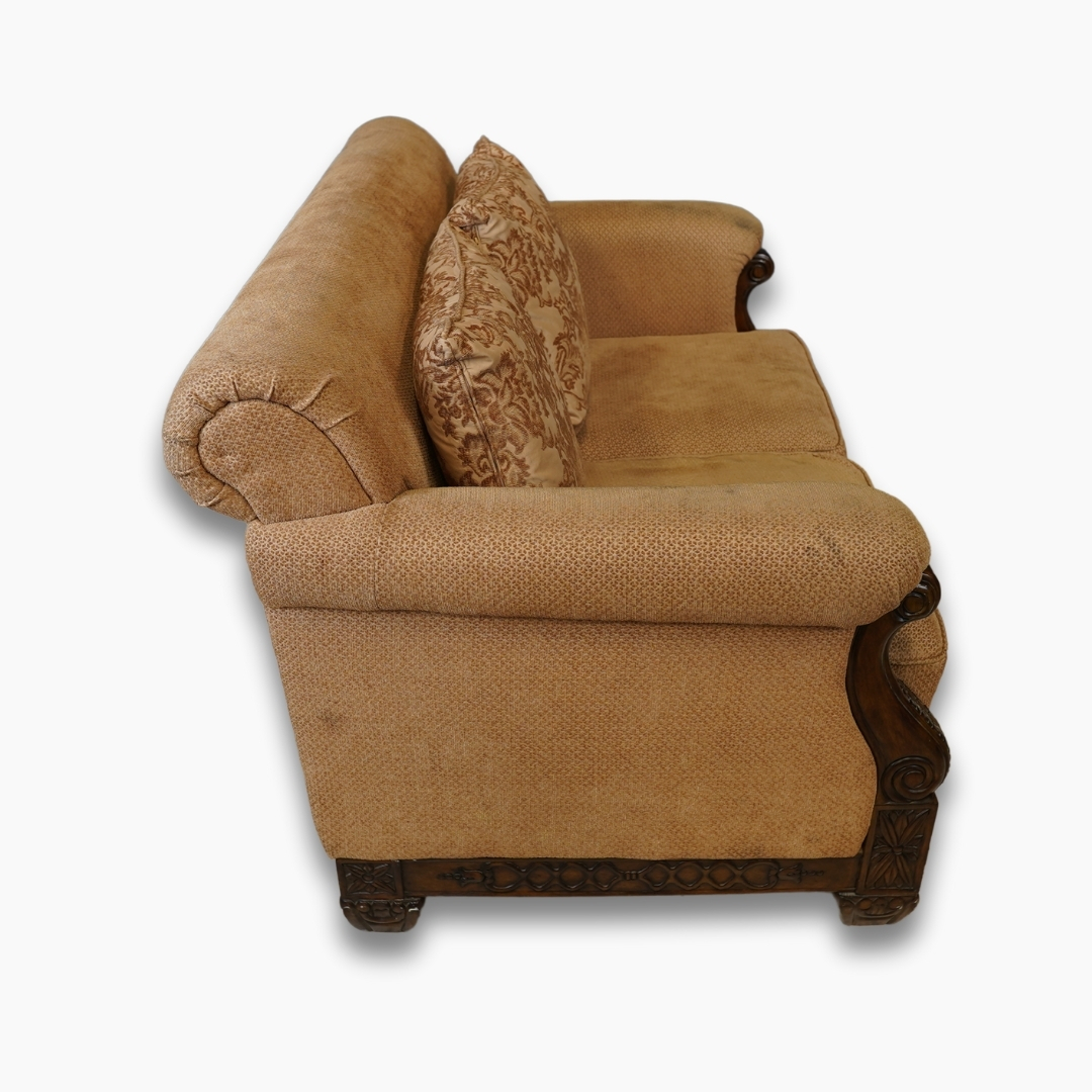 كنبة قماش باللون البيج مع هيكل خشبي ومقاعد مريحة. مناسبة لغرف المعيشة وأماكن الجلوس للاستخدام اليومي.