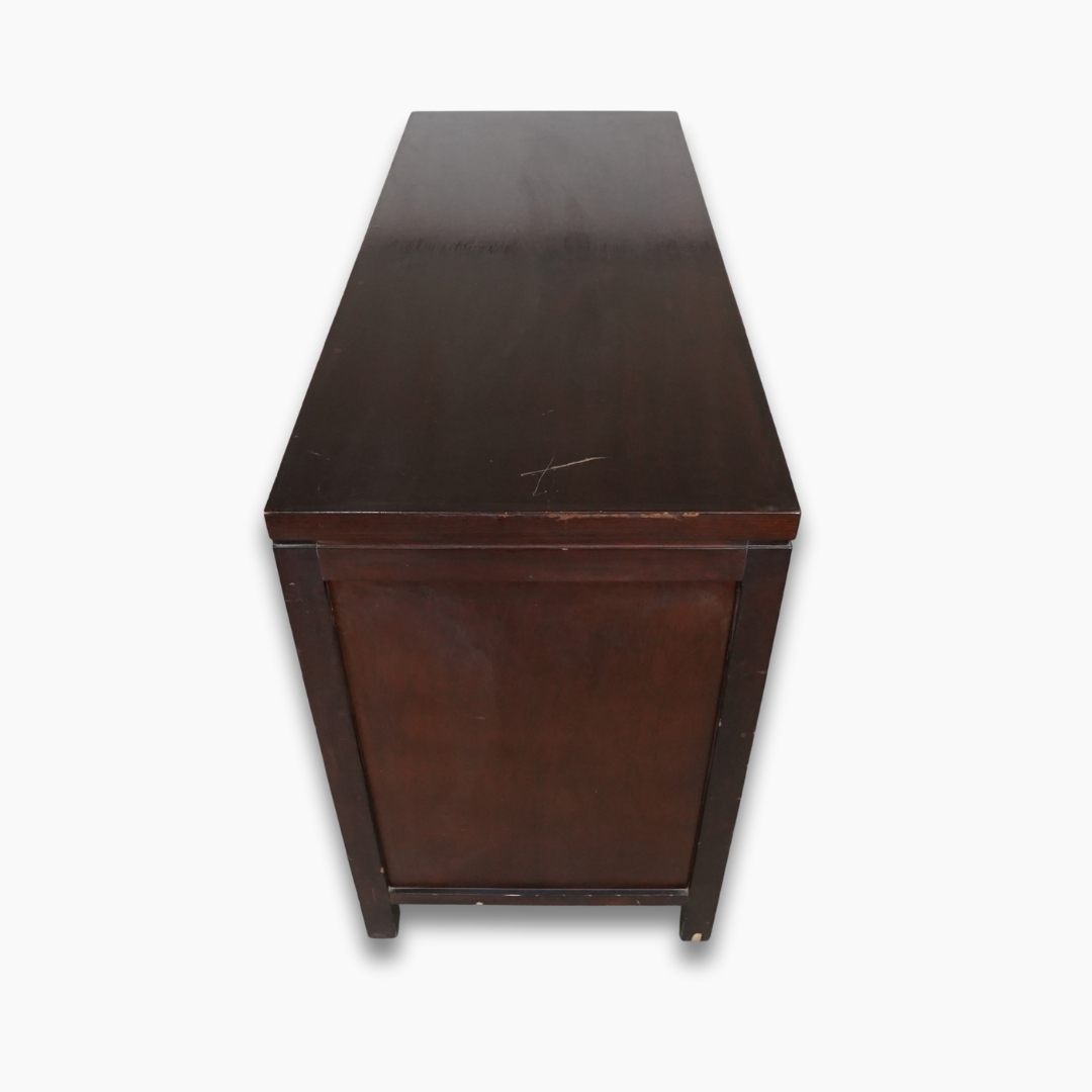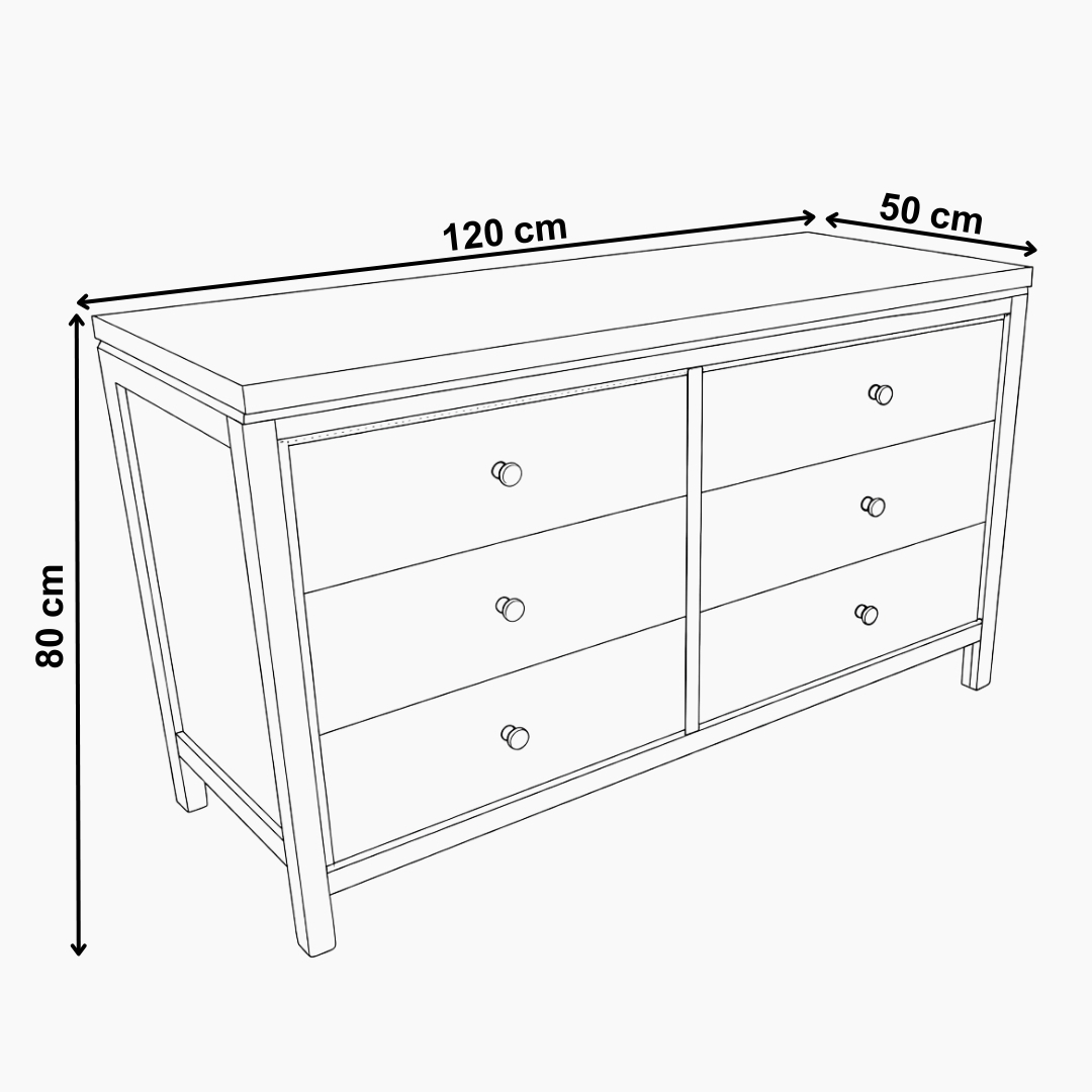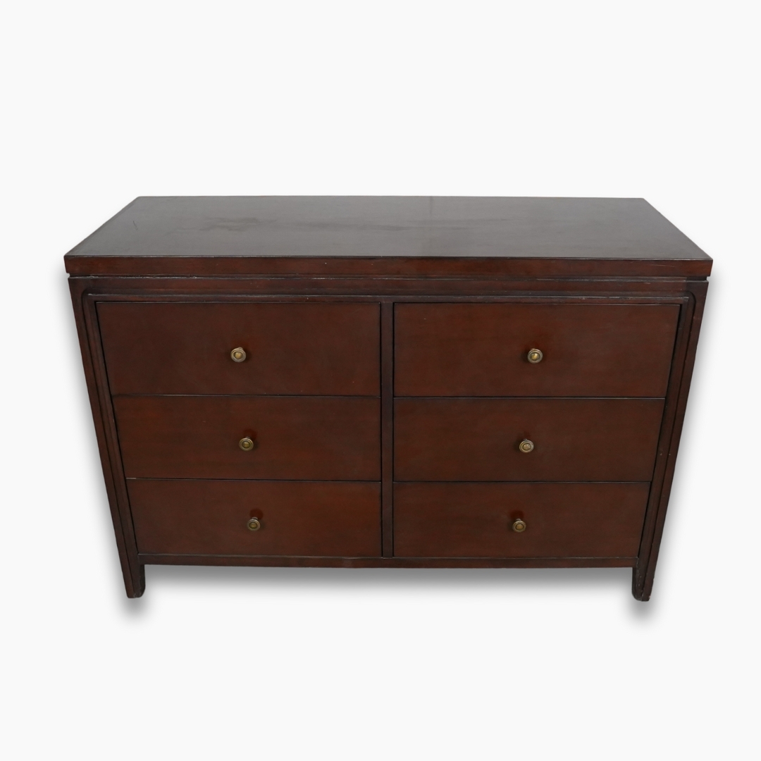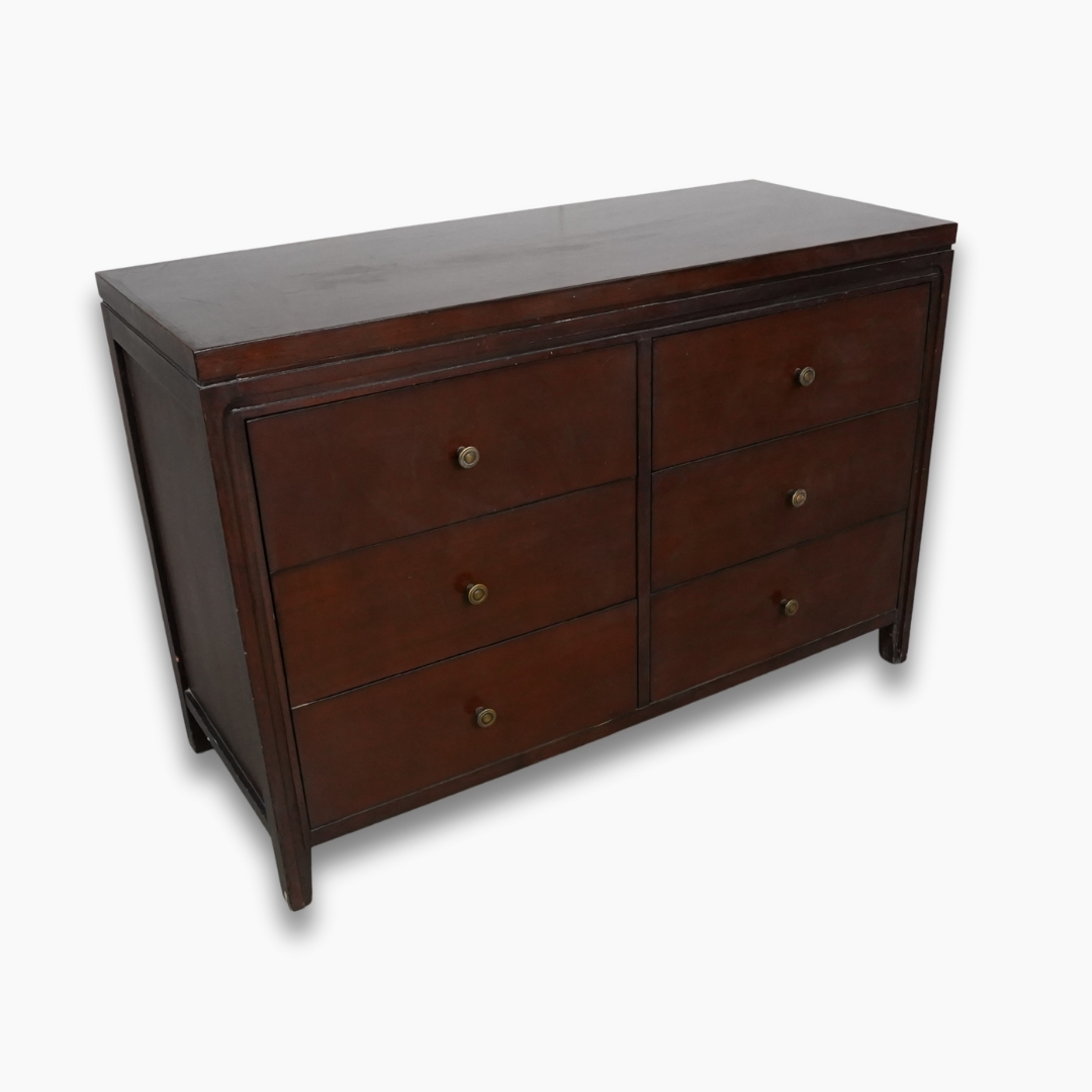 خزانة تخزين خشبية باللون البني الداكن تحتوي على ستة أدراج واسعة لتنظيم الأغراض. مناسبة لغرف النوم أو غرف المعيشة وتجمع بين المتانة والتصميم الخشبي الكلاسيكي.