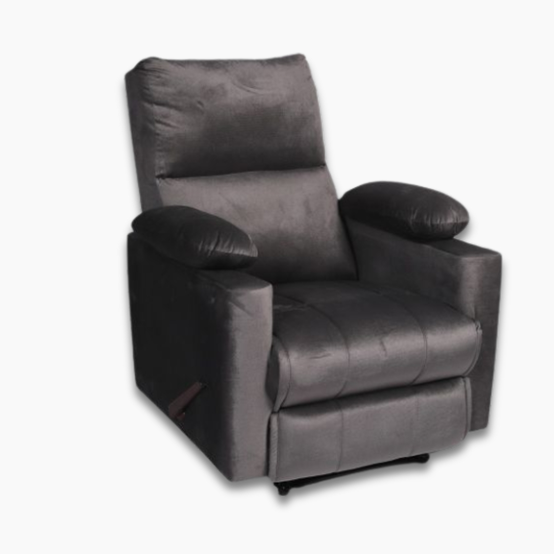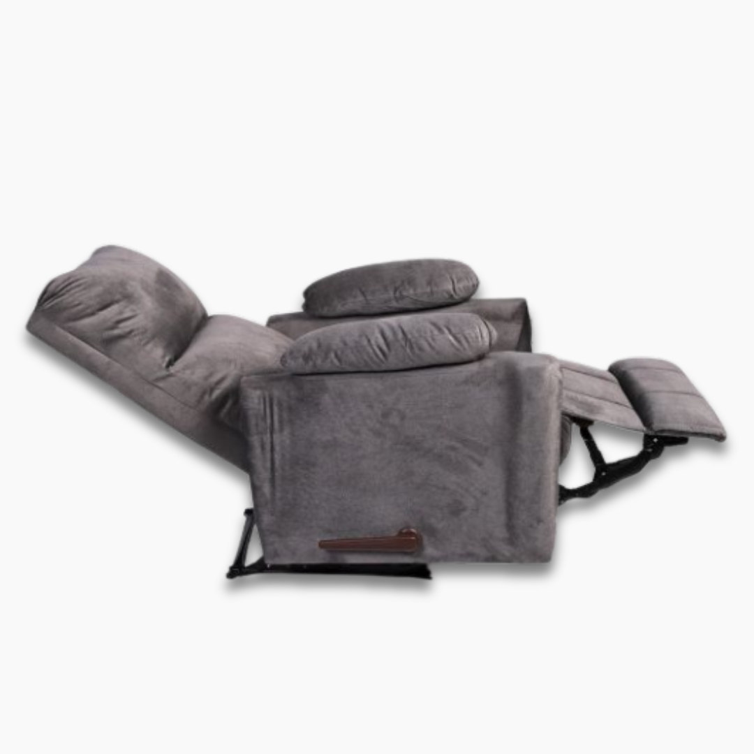 كرسي استرخاء باللون الرمادي الغامق. قماش مخملي، مع حامل للهاتف وحامل كوب مدمجين، و3 وضعيات استرخاء. لمسة من الأناقة والراحة لمنزلك.