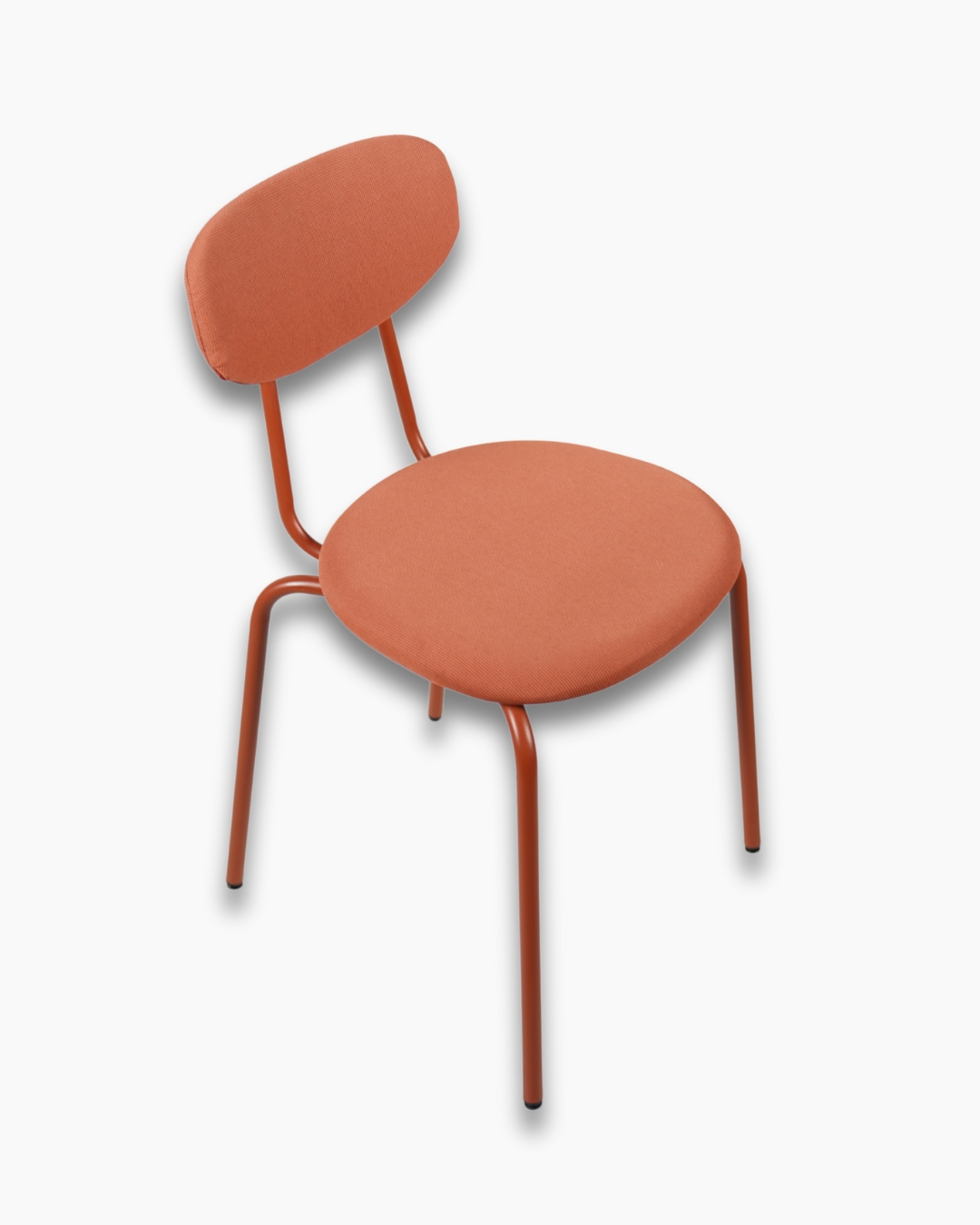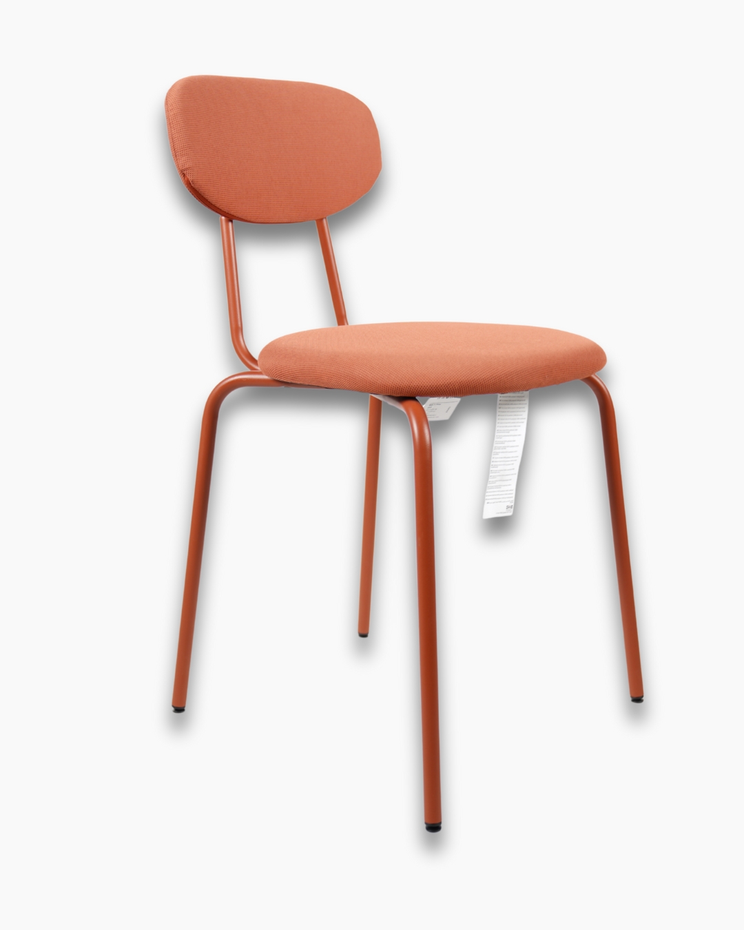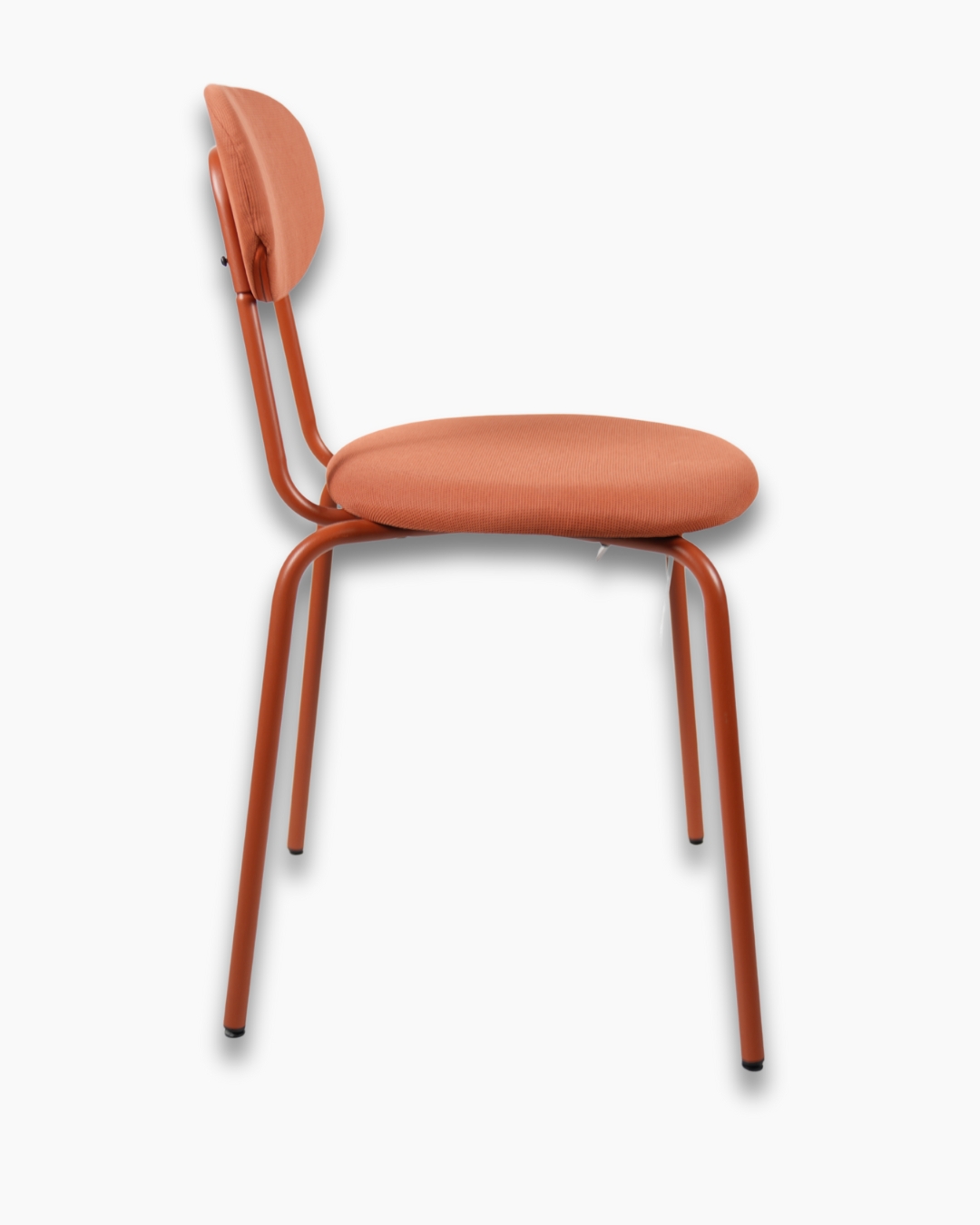 كرسي أنيق مصنوع من المعدن المتين ومغطى بقماش باللون البني المائل للأحمر، يجمع بين التصميم العصري والراحة، مثالي لغرفة الطعام أو المكتب.